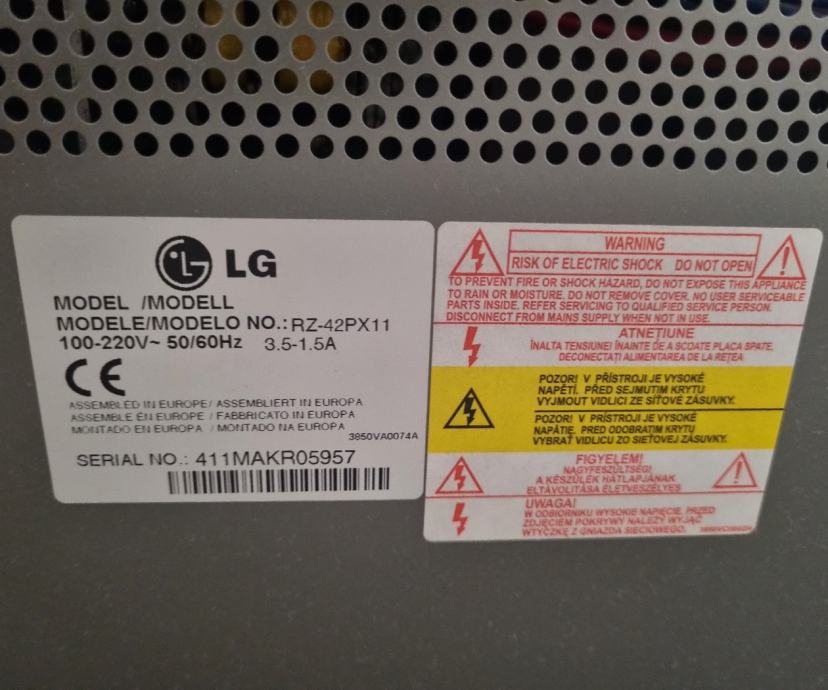 LG RZ-42PX11 dijagonala 107cm, plazma PDP televizor širokog zaslona s omjerom stranica 16:9. Rezolucija zaslona je 852 x 480 piksela s razmakom piksela od 0,36 x 1,08 mm. Omjer kontrasta (tipičan) je 3000:1, a ima kut gledanja od 160° i vodoravno i okomito. Dijagonala zaslona je 42 inča, a dimenzije su 1210 mm širine, 290 mm dubine i 699 mm visine. Televizor je snage 350 W.