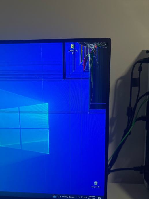 Monitor je napukao desno gore ali sve ispravno radi. Kome ne smeta- sluzit ce svrsi.