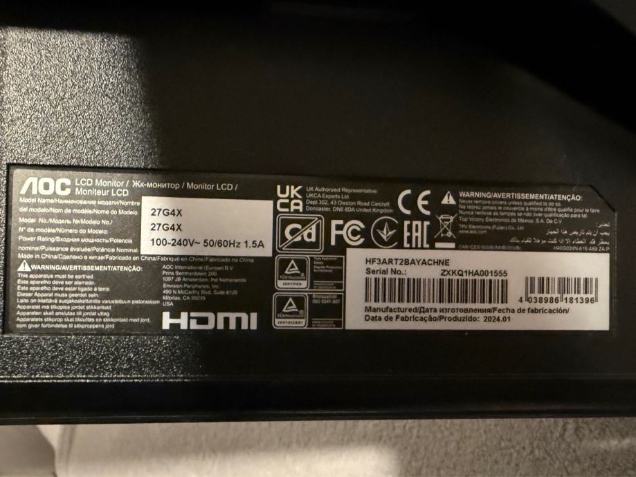 Prodajem AOC Gaming 27G4X monitor. 27’ i 180Hz. Ekran je RAZBIJEN, pogodan za dijelove ili popravak