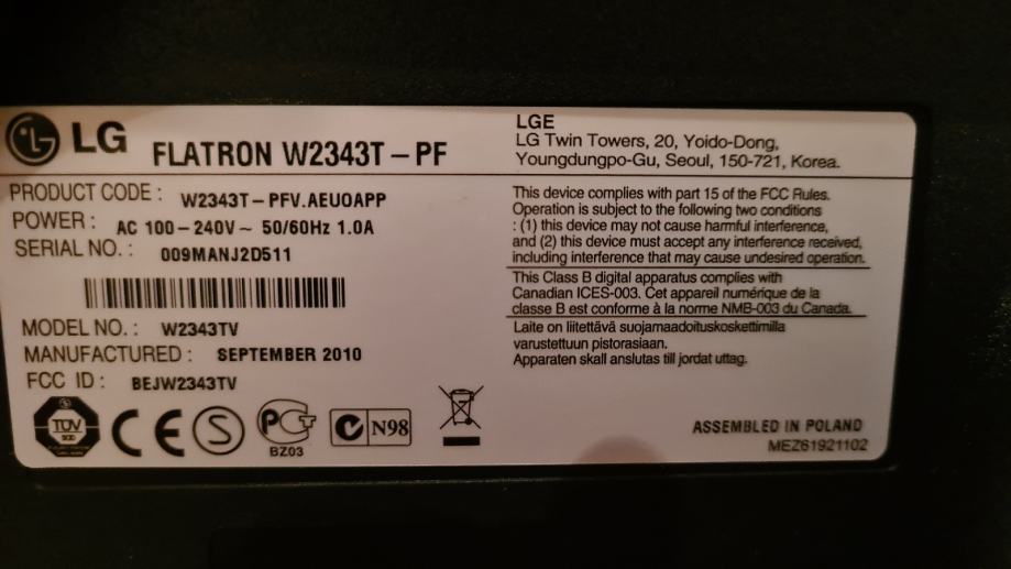 Prodajem LG Flatron W2343T-PF FullHD LED monitor.