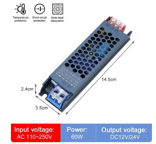 DC12/24V - 60W (5A) - Dimenzije (Dužina 14cm, širina 3cm, debljina 2cm) - 12€