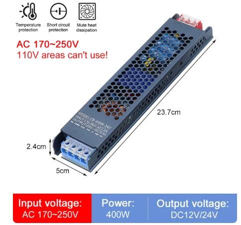DC12/24V - 400W (33,3A) - Dimenzije (Dužina 24cm, širina 5cm, debljina 2cm) - 30€