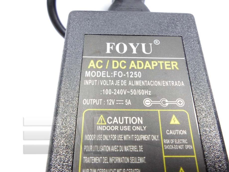 AC/DC Adapter 12V 5A napajanje namjenjeno za LED trake, nadzorne kamere i druge slične proizvode, s izlazom DC 12 V 5 A sa utikačem i izlazom s konektorom 5,5 - 2,5 mm. Napomena: Tehnički podaci: - Ulaz: AC 100-240V 50-60Hz , Izlaz: DC12V 5A -
