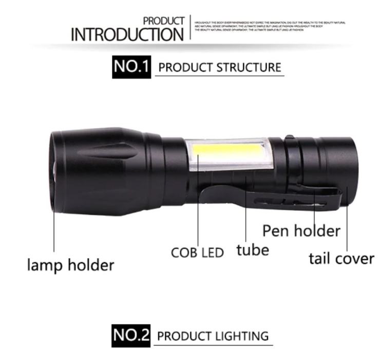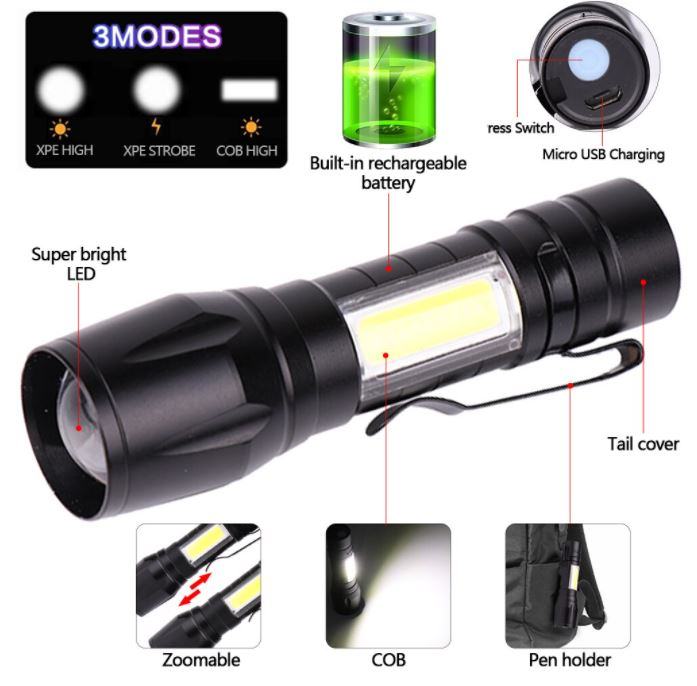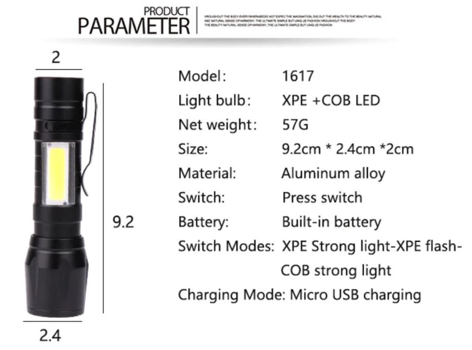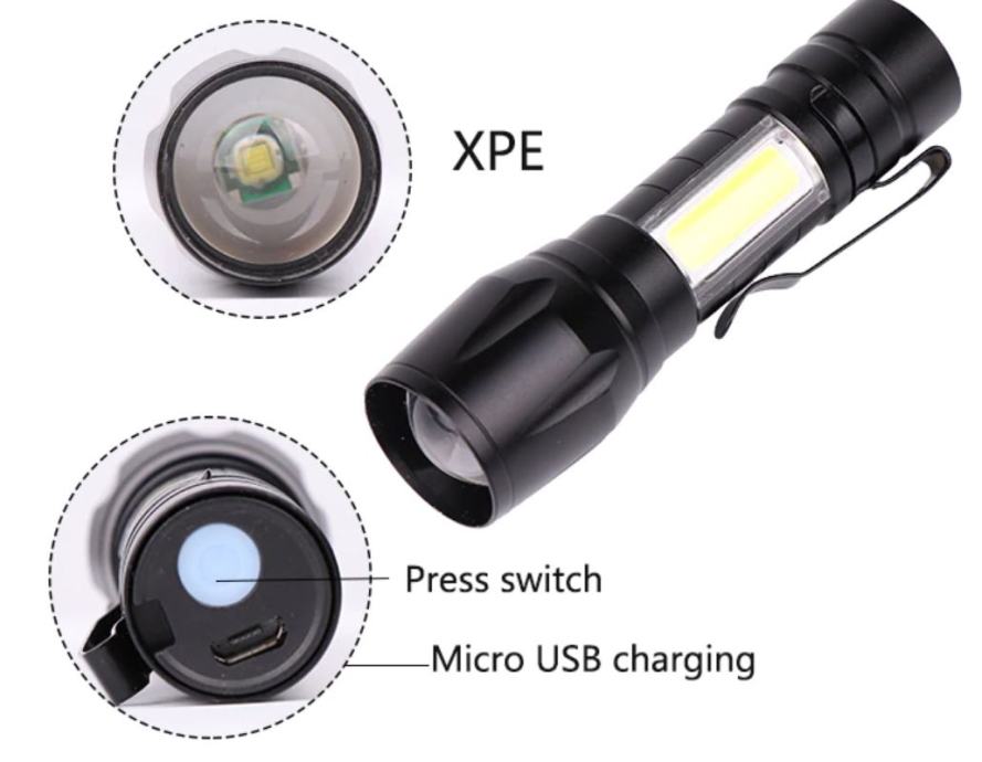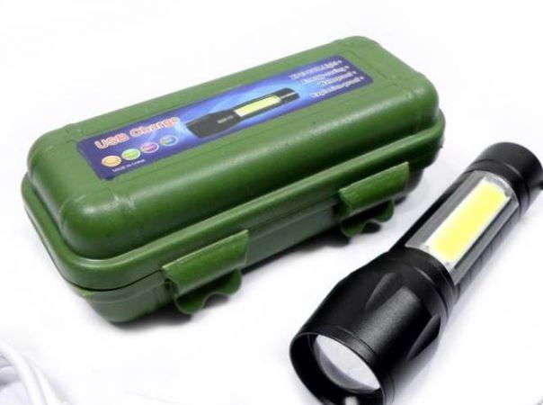 Mini Cree Led USB svjetiljka COB Light Cree LED tehnologija. Mala a izuzetno jaka i kompaktna led svjetiljka novije generacije, s prednje strane XPE LED s 2 moda rada (konstantno i prekidajuče) a bočno COB light 38mm x 15mm, aluminijsko kućište lijepog oblika otporno na udarce i padove vodootporna (nije za ronjenje), mogućnost zumiranja u uži i širi snop svijetla, štedljiva, za napajanje koristi interni akumulator, a puni se na svakom USB konektoru ili USB punjaču / adapteru pomoću priloženog USB kabla. Pakirano u plastičnu sigurnosnu kutiju.