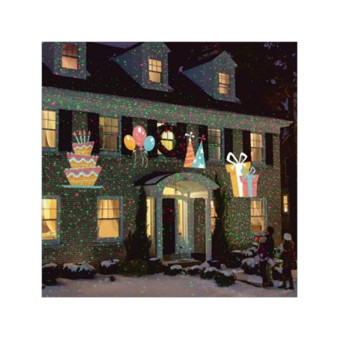 LED projektor sa 5 kartica: Božić x 2, Uskrs, Halloween, rođendan, 5 modova rada: crvena laserska točka sa LED brojkama, zelena laserska točka s LED brojevima, crvena i zelena laserska točka s LED brojevima, crveni i zeleni laser, LED figurice.