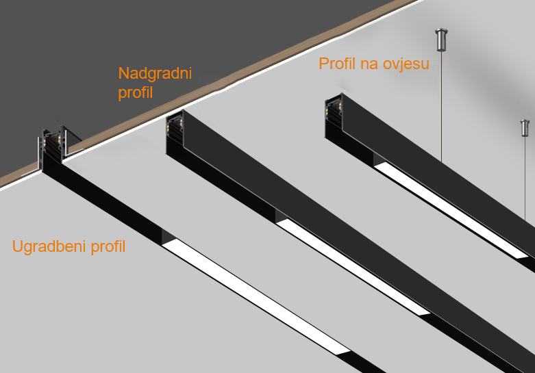 Šine duljine 100cm / 200cm, ugradbene i nadgradbene koje se mogu rezati ili produljiti na potrebnu dimenziju, sa spojnim priborom za mehaničko i električno povezivanje u cjelinu.