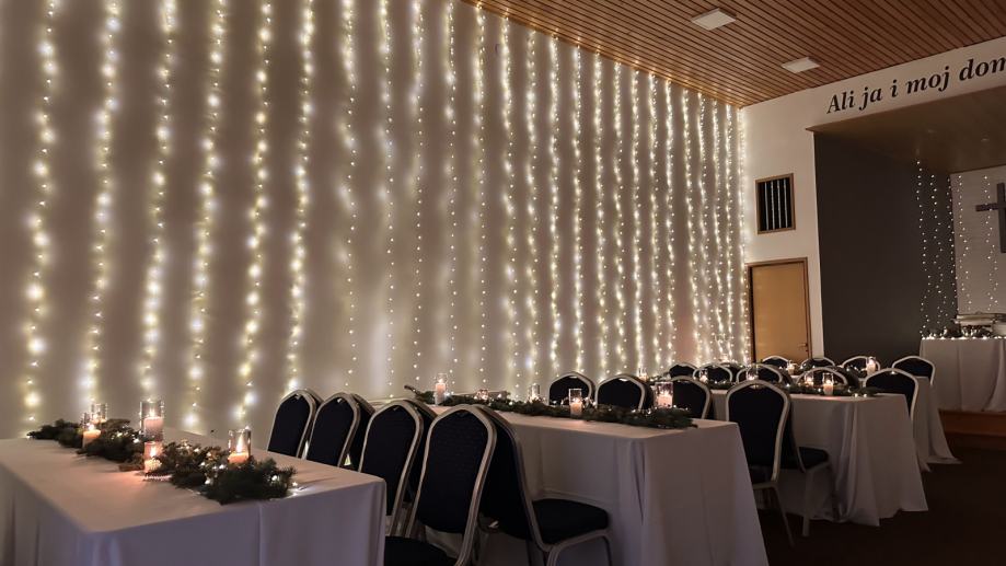 Prodajem lampice kupljene i korištene jednom za potrebe svadbe, lampice su na baterije te se lako postavljaju. Lampice su lanci duljine 3, 5 i 10 metara, zavjese dužine 6 metara te 16 zlatnih lanaca u obliku listića od 3 metra. Ima oko 300 metara lampica, ukoliko je potrebno mogu izračunati točnu metražu lampica.