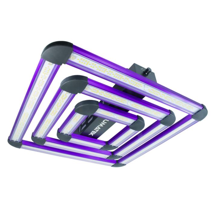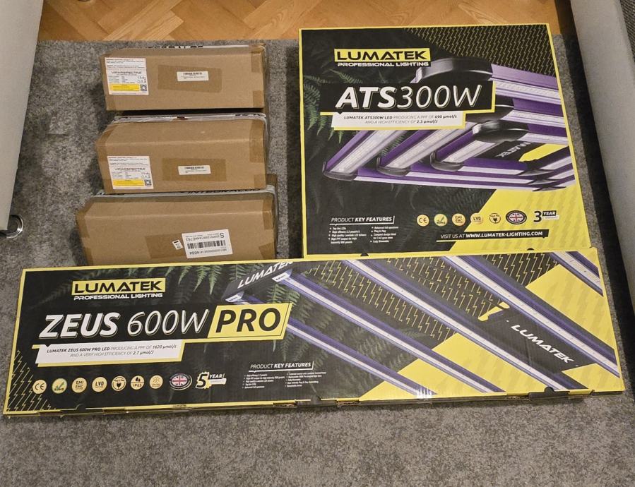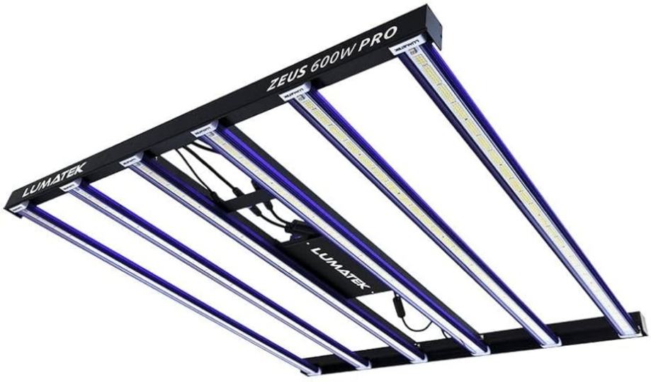 The Lumatek Zeus 600W Pro 2.7 is a high-efficiency LED grow light with 2.7 µmol/J efficacy, producing a strong 1620 µmol/s PPF (Photosynthetic Photon Flux) for a 600W draw, covering up to a 1.5m x 1.5m area with a balanced full spectrum using top-bin LEDs and drivers from Osram/Philips, featuring dimming, external control (0-10V), IP65 waterproof rating, and detachable drivers for remote use, built for uniform light spread across grow tents or multi-layer systems.