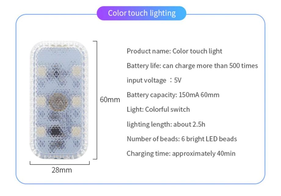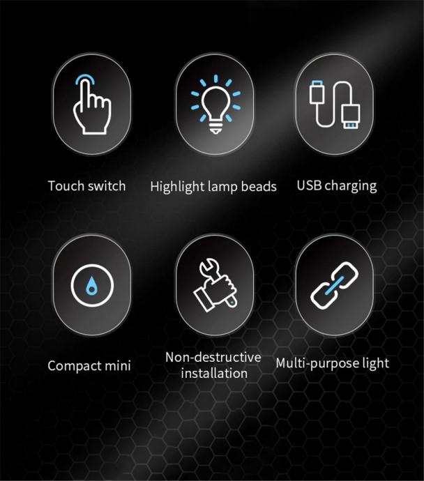 Malih je dimenzija, jednostavna za instalaciju (obostrano ljepljiva traka, magnet), ima prekidač na dodir, 6 LED dioda, svijetli u 7 boja (konstantno ili s izmjenom).