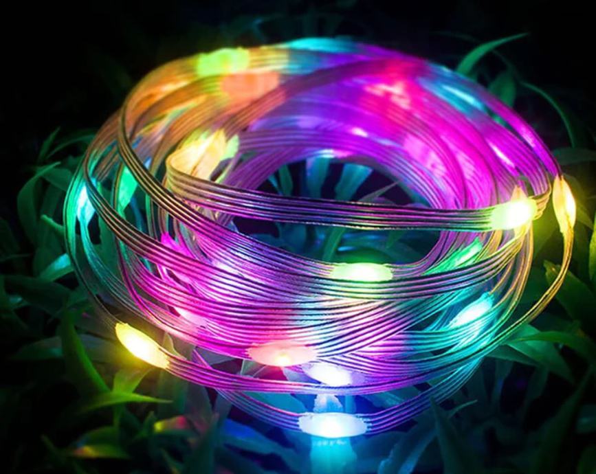 VišenamjenskaPametna Bluetooth USB LED RGB svjetla 20m/Smart Fairy Lights potpuno novi model LED dioda koja je sada stavljena na izoliranu žicu te se time dobio vrhunski vodootporan proizvod sa mnogo opcija. Lampicama se upravlja pomoću IR daljinskog upravljača ili aplikaciom sa svakom smartphonu ili gumbićem na USB bluetooth kontroleru.