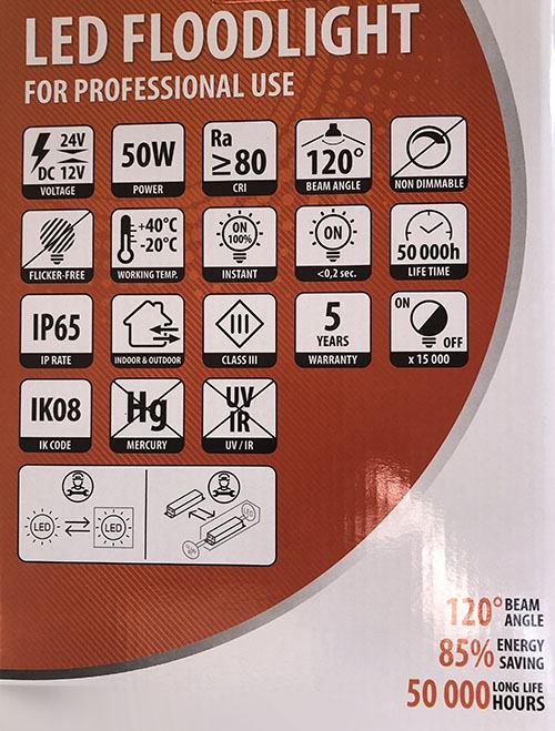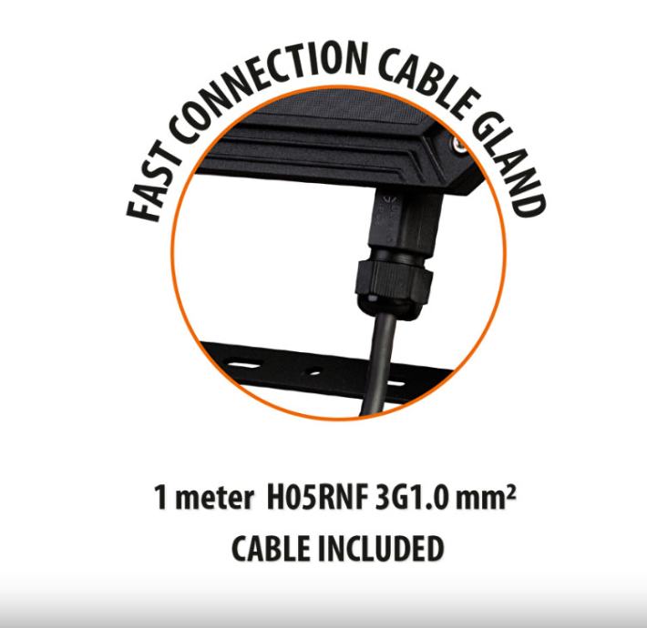 Snaga 50W / 6000Lm. Isporučuje se s gumiranim kablom za napajanje duljine 1met, a moguće je i jednostavno priključiti novi vanjski kabel kroz uvodnicu i terminal za spajanje na samom reflektoru.