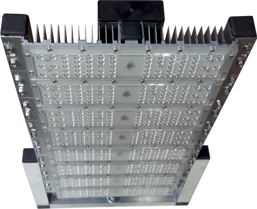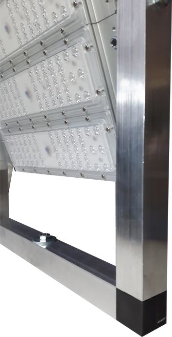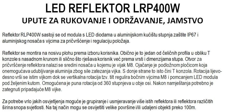 Reflektor RLP400W sastoji se od modula s LED diodama u aluminijskom kućištu stupnja zaštite IP67 i aluminijskog nosača s vijcima za pričvršćenje i regulaciju položaja.