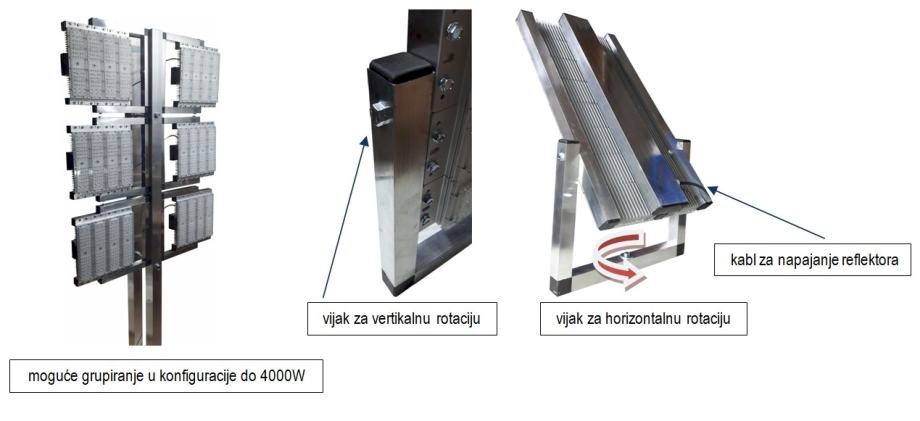 Reflektor se montira na nosivu plohu prema izboru korisnika. Obično je to jedan od čeličnih profila u obliku T konzole s nasadnom krunom ili slično što rješava korisnik već prema vrsti i dimenzijama stupa. Otvor za pričvršćenje reflektora nalazi se sredini nosača u kojemu je vijak M8. Ojačanje je podložnom pločicom koja onemogućava udubljivanje aluminija zbog sile zatezanja vijka. S donje strane to isto čini T konzola. Rotacija lijevo-desno vrši se istim vijkom dok se vertikalna rotacija tzv. tilt regulira bočnim vijcima M8 i pomcanjem LED modula pod željenim kutom. Omogućena je puna rotacija od 360 stupnjeva u obje osi. Nakon namještanja potrebno je zategnuti pripadajuće M8 vijke.