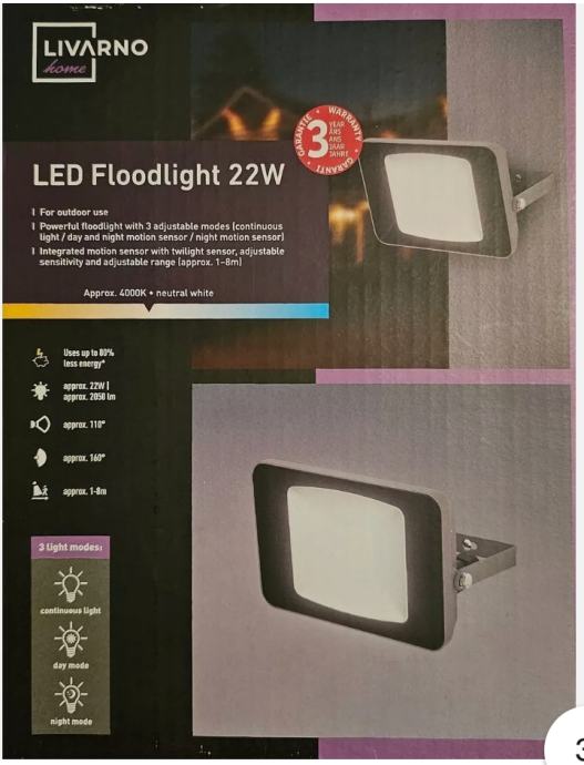 Snažni reflektor s 3 podesiva modusa (trajno svjetlo / dnevni i noćni senzor pokreta / noćni senzor).