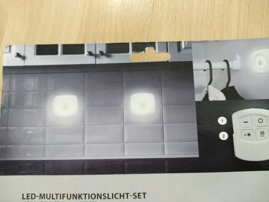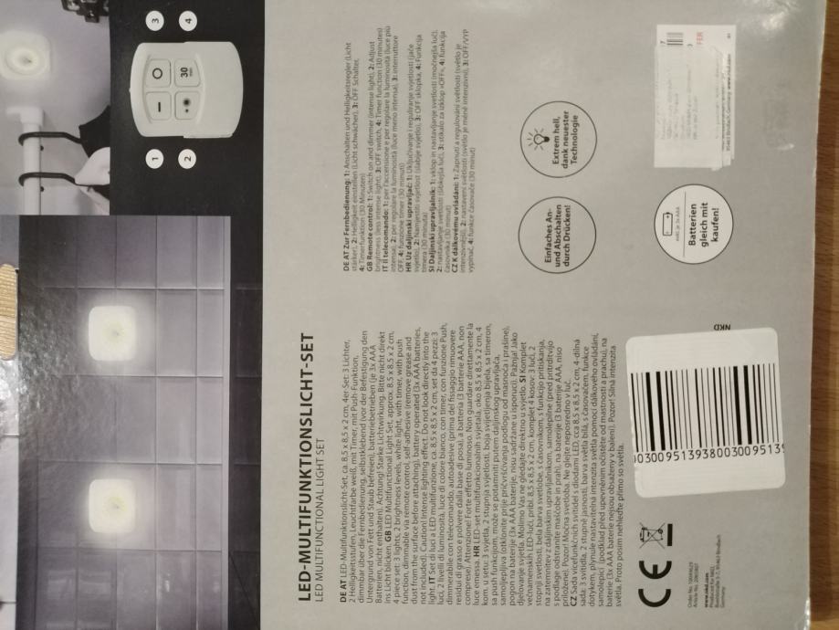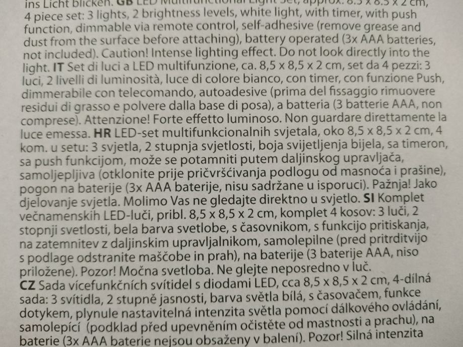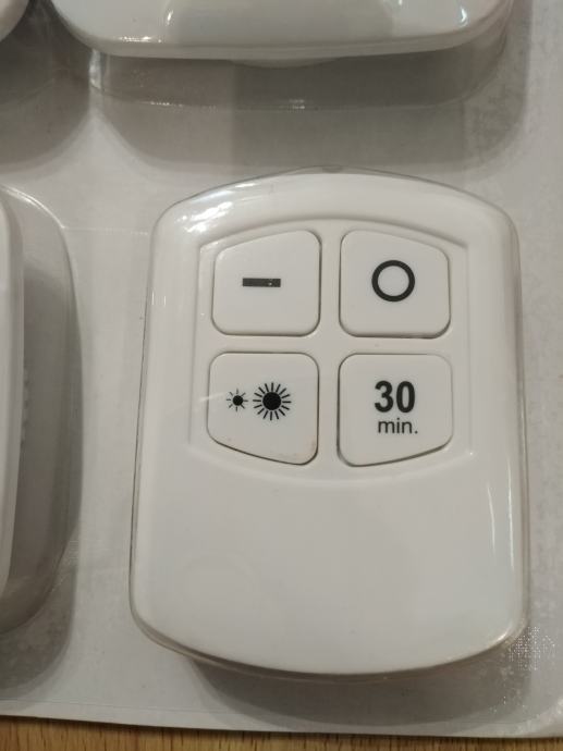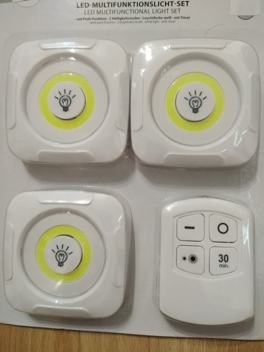 Set se sastoji od tri LED svjetla dimenzije oko 8,5x8,5x2cm i daljinskog upravljača