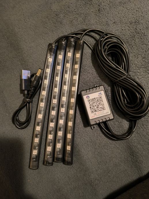 bluetooth led trake u boji, upravljanje bojama pomocu aplikacije na mobitelu. 36 led dioda u cetri trake. spajaju se na usb, punjac za mobitel, racunalo ili usb u autu