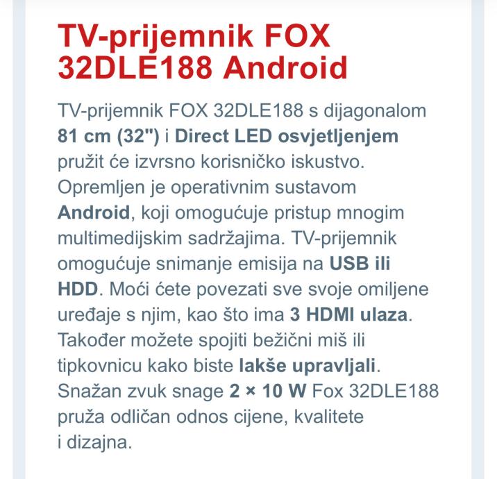 TV-prijemnik FOX 32DLE188 s dijagonalom 81 cm (32") i Direct LED osvjetljenjem pružit će izvrsno korisničko iskustvo. Opremljen je operativnim sustavom Android, koji omogućuje pristup mnogim multimedijskim sadržajima. TV-prijemnik omogućuje snimanje emisija na USB ili HDD. Moći ćete povezati sve svoje omiljene uređaje s njim, kao što ima 3 HDMI ulaza. Također možete spojiti bežični miš ili tipkovnicu kako biste lakše upravljali. Snažan zvuk snage 2 × 10 W Fox 32DLE188 pruža odličan odnos cijene, kvalitete i dizajna.