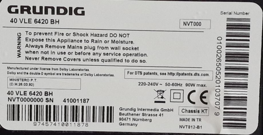 GRUNDIG 40 VLE 6420 BH. Ne podražava DVBT2 - HEVC signal, te je potreban dodatni priijemnik. Cijena za DVBT2-HEVC prijemnik je 10 €.