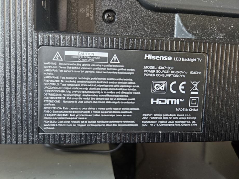 Rabljeni Hisense 43A7100F, 43" / 108 cm. Rezolucija 4K, smart, sa daljinskim i postoljem. Ima dvije svjetlije točke na ekranu, zaokruženo na slici. Sve radi, samo je taj dio ekrana svjetliji, kod gledanja TV-a skoro se i ne vidi.