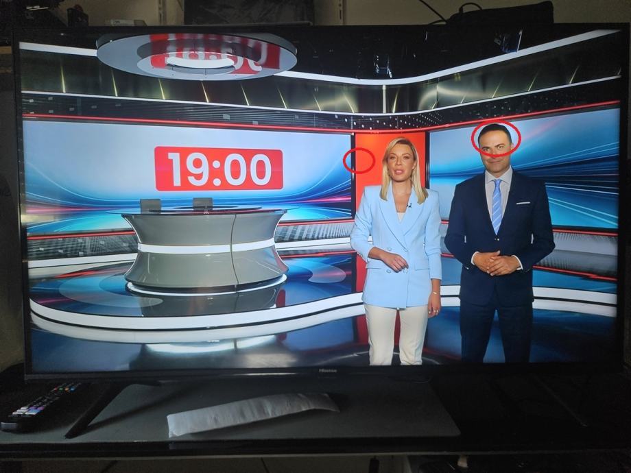Rabljeni Hisense 43A7100F, 43" / 108 cm. Rezolucija 4K, smart, sa daljinskim i postoljem. Ima dvije svjetlije točke na ekranu, zaokruženo na slici. Sve radi, samo je taj dio ekrana svjetliji, kod gledanja TV-a skoro se i ne vidi.