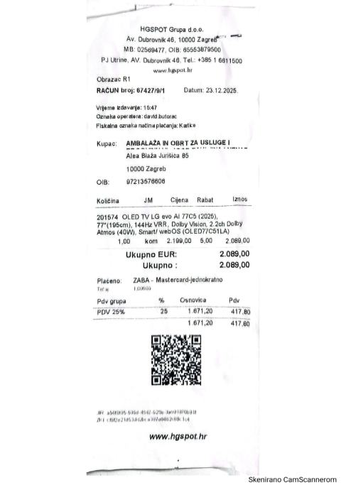 Prodajem OLED LG 77C5, kupljen 23.12.2025. u HG SPOT-u u Utrinama, vidljivo po računu u galeriji. Potpuno je novi, nekorišten, isproban samo u dućanu pri kupnji. Zapakiran je u originalnom pakiranju te se tako i prodaje. Garanciju ima 2 god + 3 god nakon registracije. Preuzimanje u Mičevcu po dogovoru.