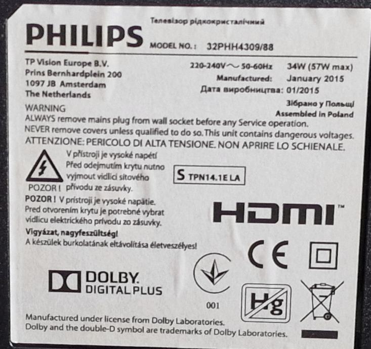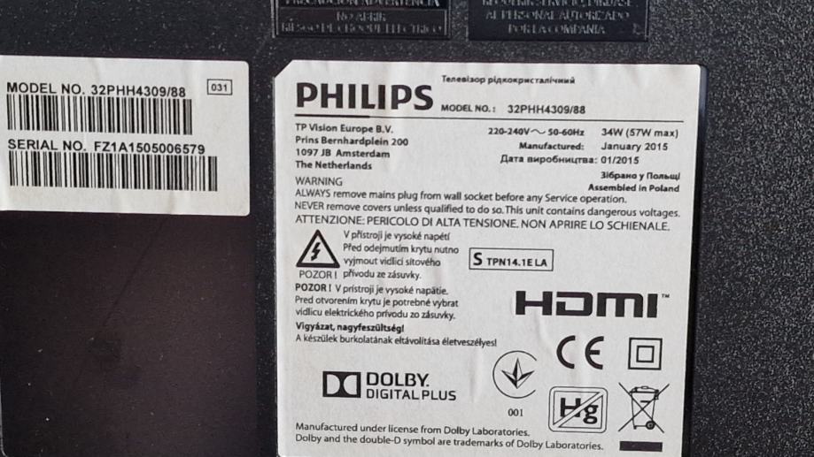 PHILIPS TV, MODEL:32PHH4309/88. Ne podražava DVBT2 - HEVC signal, te je potreban dodatni priijemnik. Cijena za DVBT2-HEVC prijemnik je 10 €.