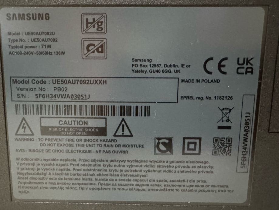 Samsung Tv kupljen je 11/2023. godine. Tv je još pod garancijom. Smsung UE50AU7092UXXH je 50-inčni 4K Ultra HD Smart TV iz Samsungove serije 7, predstavljen 2021. godine.