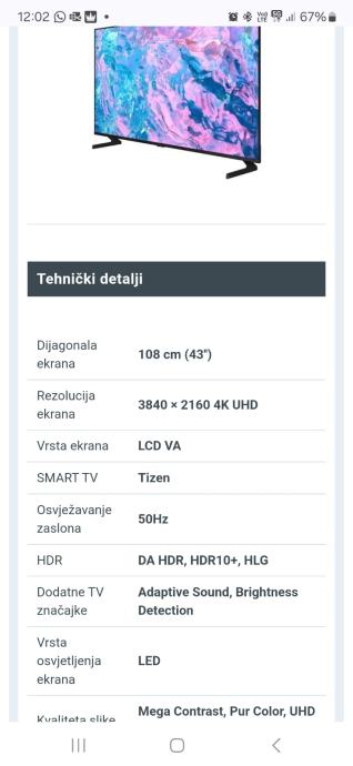 Dijagonala ekrana108 cm (43'')Rezolucija ekrana3840 × 2160 4K UHDVrsta ekranaLCD VASMART TVTizenOsvježavanje zaslona50HzHDRDA HDR, HDR10+, HLGDodatne TV značajkeAdaptive Sound, Brightness DetectionVrsta osvjetljenja ekranaLEDKvaliteta slikeMega Contrast, Pur Color, UHD DimmingSustav zvučnika20W, 2CHZvukOTS Lite, Q-SymphonyProcesorCrystal Processor 4KPovezivanjeBluetooth 5.2, WiFi 5Veze3× HDMI,1 x USB-A, Ethernet (LAN), eARC/ARC, Anynet+ (HDMI-CEC)PrijemnikDVB-T2CS2Daljinski upravljačTM2240Masa (s postoljem)7,2 kgMasa (bez stalka)7,1 kgDimenzije (s postoljem)957,2 × 617,7 × 179,1 mmDimenzije bez stalka:957,2 × 557,7 × 81,1 mmBojacrnaVESAstandard 200 × 200