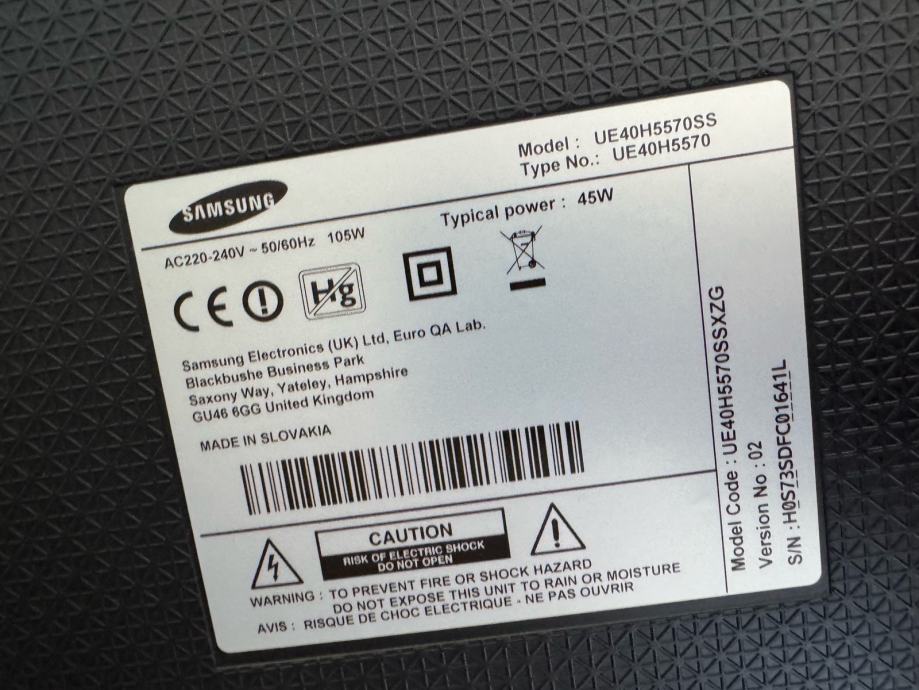 Samsung UE40H5570SS. Dijagonala zaslona: 101,6 cm (40"), Rezolucija zaslona: 1920 x 1080 piksela, Vrsta HD-a: Full HD, Oblik zaslona: Ravni. Pametni TV. Tehnologija interpolacije pokreta: CMR (Clear Motion Rate) 100. Sustav digitalnog signala: DVB-C, DVB-S2, DVB-T. Wi-Fi, Ethernet LAN. Boja proizvoda: Crna