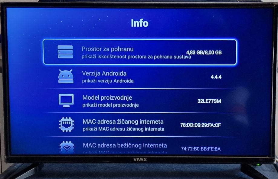 VIVAX LED TV-32LE77SM. Verzija Androida je 4.4.4.