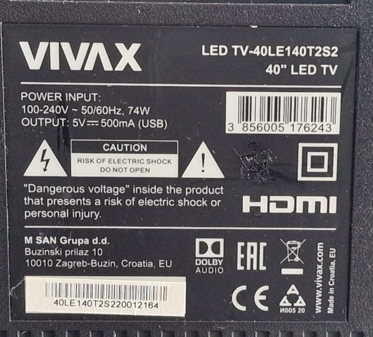 VIVAX - LED TV-40LE140T2S2 DVBT2 - HEVC, 102cm. Uz TV dolazi i daljiinski upravljač. Nije potreban dodatan prijemnik.