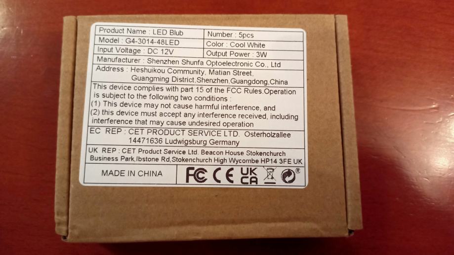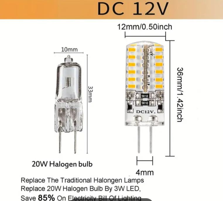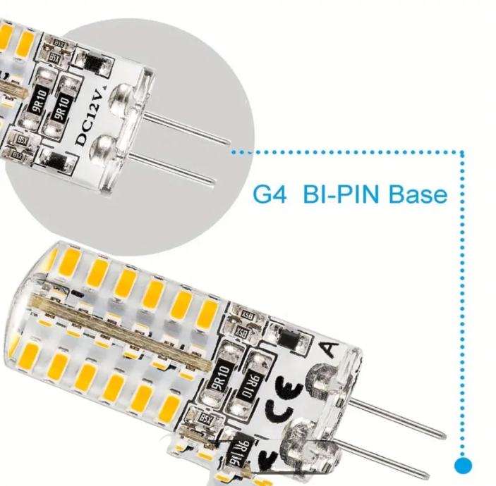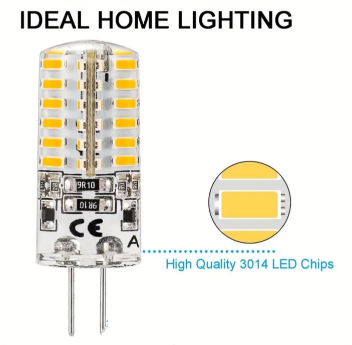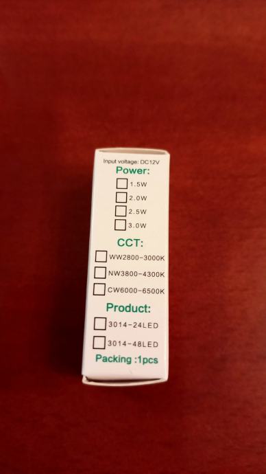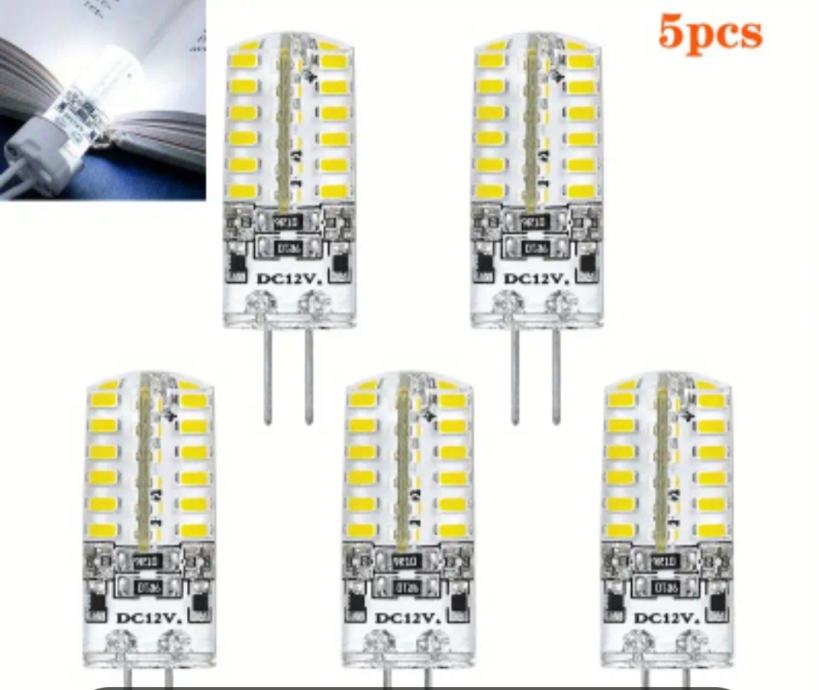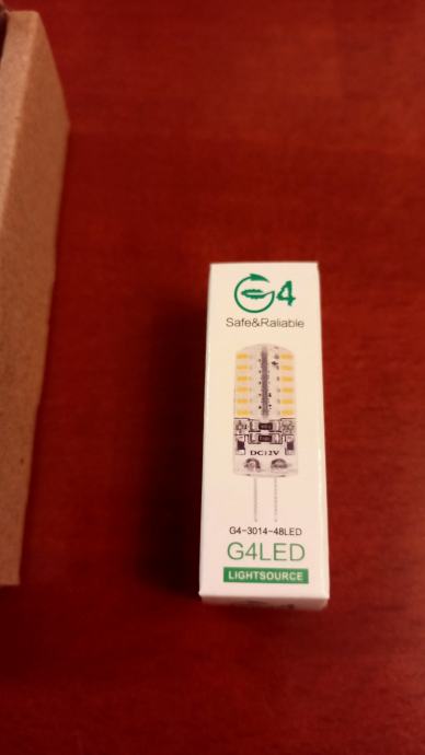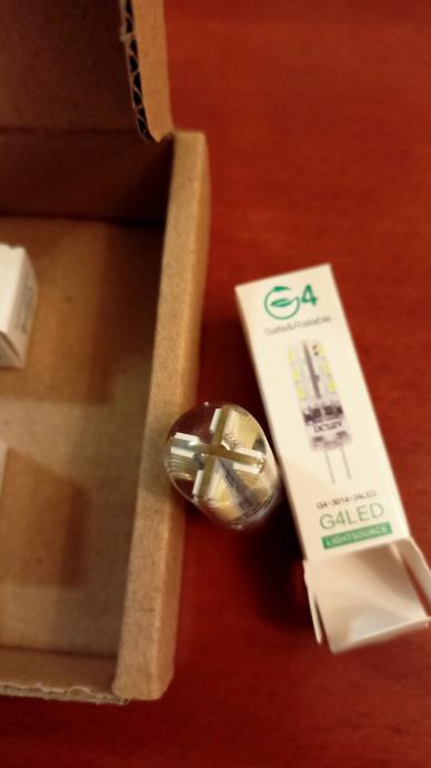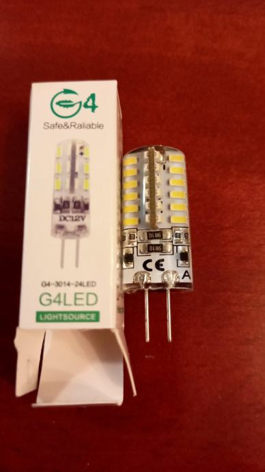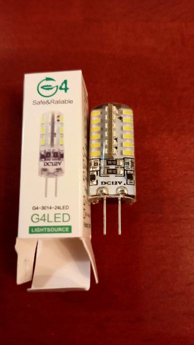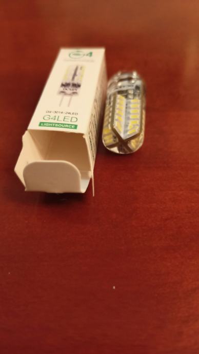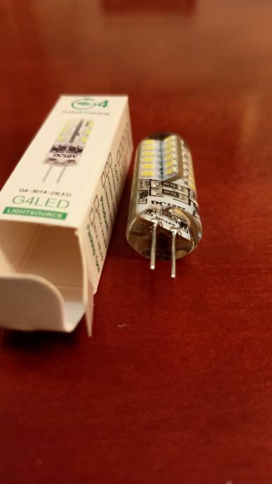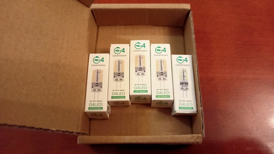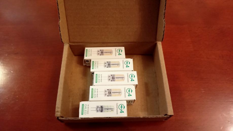 LED žarulja snage 3W ekvivalent 20W, bez zagrijavanja, u silikonskoj ovojnici. Zamjena za T3 halogenskoj žarulji. Voltaža 12V, hladna bijela 7000K. Jednostavna instalacija, standardna G4 baza, lako se može postaviti umjesto običnih halogenih žarulja. Životni vijek je preko 35000 sati, štedi napor i troškove održavanja zbog čestih zamjena žarulja. Ušteda na računu za struju, zamijenite 10W-20W halogensku žarulju s 3W LED žaruljom, uštedite 85% na računu za struju za osvjetljenje. Bez olova ili žive bez UV ili IR zračenja. Led količina je 48 led komponenti sa 3014 led chipova po jednoj žarulji, jače osvijetljenje od takvih sličnih (kutijice su iste za 24 led i 48 led). Prodajem u kompletu 5 komada. Cijena za komplet 15 €. Molim zvati na mob. 091/2356157