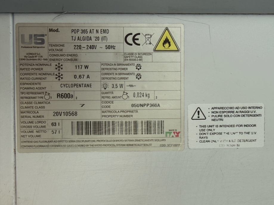 Prodajem profesionalni zamrzivač marke U5 (Ucinque), model POP 365 AT N EMD, namijenjen za čuvanje smrznutih proizvoda. Radi se o sanduk zamrzivaču s gornjim otvaranjem, bruto volumena 63 litre i neto volumena 57 litara.