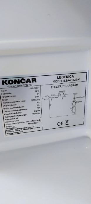 Mini zamrzivač bijele boje Končar star 2 godine bez oštećenja kao nov visina 49.2 širina 47.2 dubina 45 cm reguliranje temperature svjetlo nogice za niveliranje promjenjiv smjer otvaranja vrata težina 15 kg mogučnost dostave po zagrebu