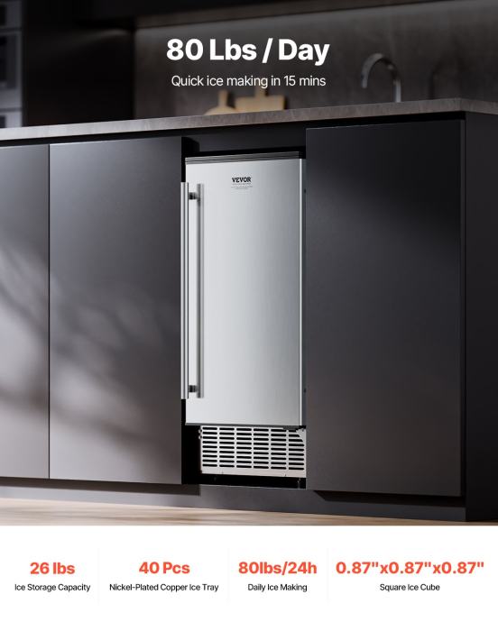 Ovaj podpultni ledomat ima odvod učinkovito ispuštanje vode, održavajući jedinicu čistom i produžujući joj životni vijek. Može se postaviti u kuhinje, dnevne sobe, terase, pa čak i na kamp prikolice ili brodove.