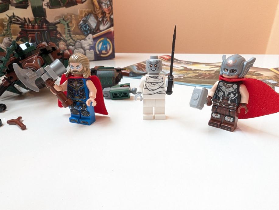 U složivom kompletu dolaze 3 popularne figurice: tu su Gorr, koji priziva Čudovište iz Sjene, Thor sa sjekirom Stormbreaker i Mighty Thor s čekićem Mjölnirom.