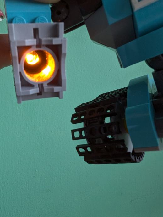 Impress your friends with this awesome model! This characterful Robo Explorer features an azure, black and gray color scheme, bright-green eyes, working tracks, rotating body and head, and posable arms with working claw and searchlight.