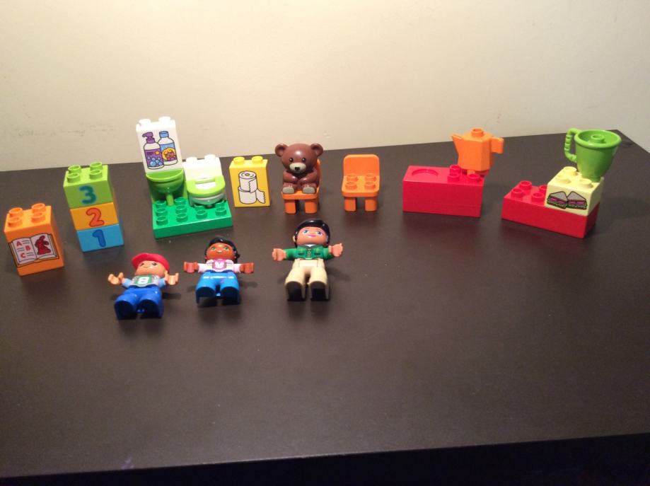 Sadrži tri figurice: učitelj i dvoje djece u predškoli.