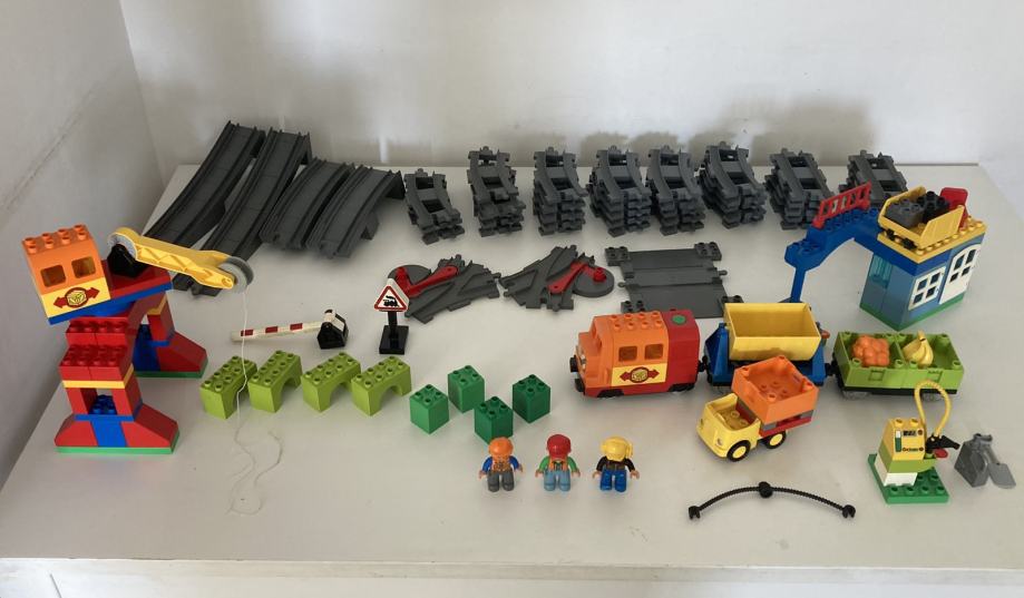 Opsežan lego duplo uključuje tracnice, skretnice, prijelaz, rampu, znak, likove, vlak i ostale dijelove