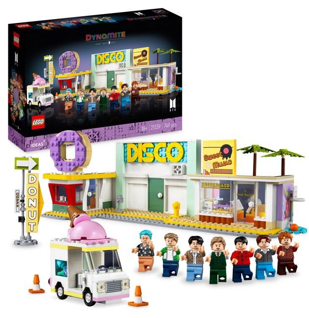Capture the joyful energy of 21st-century pop icons RM, Jin, SUGA, j-hope, Jimin, V and Jung Kook with the LEGO® Ideas BTS Dynamite (21339) music video set. Find your building groove to recreate colourful scenes from the video for their multi-platinum single Dynamite, with LEGO brick versions of the disco, record shop, doughnut shop, ice-cream van and more. Add LEGO minifigures of the group members to the different locations or place them all on the special stage and turn the wheel to see them dance.Just like the Dynamite videoA great gift idea for those who love BTS, this play-and-display model is packed with authentic details, such as BTS records in the record shop, buildable palm trees and the basketball hoop in front of the wall with a mural. Find instructions in the box and on the LEGO Builder app to guide every step of your fun build.Welcome to your zoneExplore LEGO Sets for Adults, a curated selection of exciting models. Whatever your passion, there is a set for you.LEGO® Ideas BTS Dynamite music video set (21339) – Build your love for BTS by recreating scenes from the video for their global hit single Dynamite with this play-and-display setLEGO® minifigures of all the BTS group members – RM, Jin, SUGA, j-hope, Jimin, V and Jung Kook minifigures, each with microphone elementsBuild scenes from the video – LEGO® brick versions of the disco, record shop and doughnut shop, each packed with authentic details, plus the ice-cream van, basketball hoop and 2 palm treesRecreate a BTS group dance – Place all the BTS minifigures on the detachable stage and turn the wheel to see them dance togetherFun gift idea – Treat yourself or give this collectible 749-piece LEGO® Ideas set as a birthday, Christmas or surprise gift for those who love BTS or any keen LEGO builderMade for play and display – This main building model measures over 14 cm (5.5 in.) high, 38 cm (15 in.) wide and 16 cm (6 in.) deepStep-by-step guide – Includes a booklet with illustrated instructions, plus the story of BTS and their rise to global fame as well as interviews with the set’s fan designers and LEGO® designersChosen by LEGO® fans – This building set for adults is one of many LEGO Ideas sets created by fan designers, voted for by LEGO fans and produced by the LEGO GroupPremium quality – LEGO® bricks satisfy strict industry quality standards to ensure that they connect simply and securely for robust buildsSafety assurance – LEGO® components are rigorously tested and analysed to make sure that they comply with stringent global safety standards