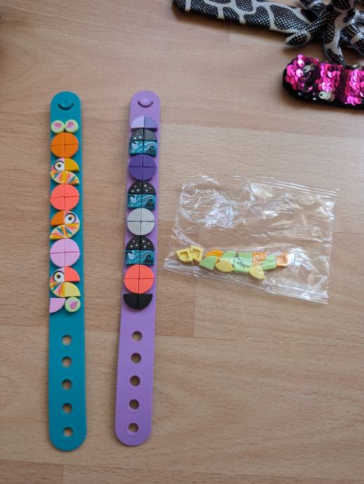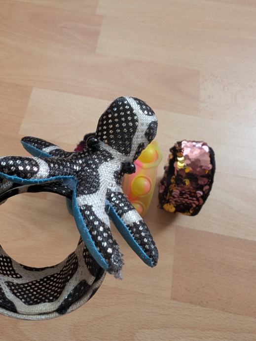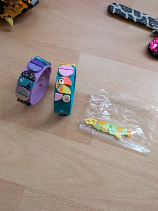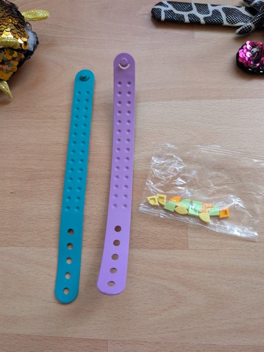 Lego dvije narukvice na koje se mogu slagati legići, jedna pop it narukvica i tri narukvice koje se sklope na ruci, kao i privjesak pile / pilić koji se može objesiti npr. na školsku torbu ili negdje drugdje.