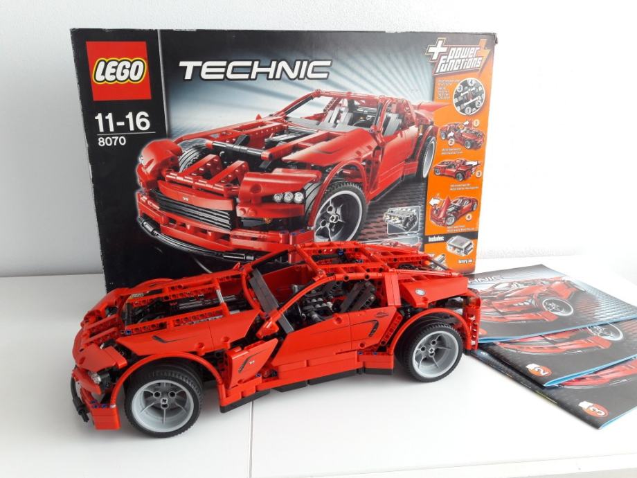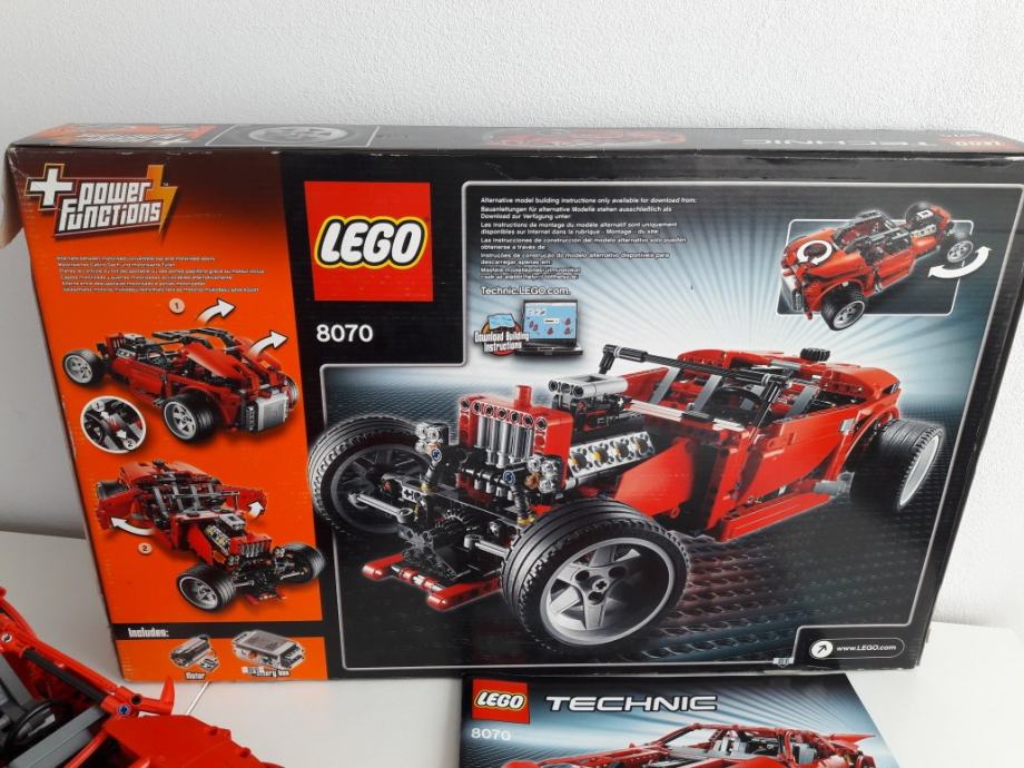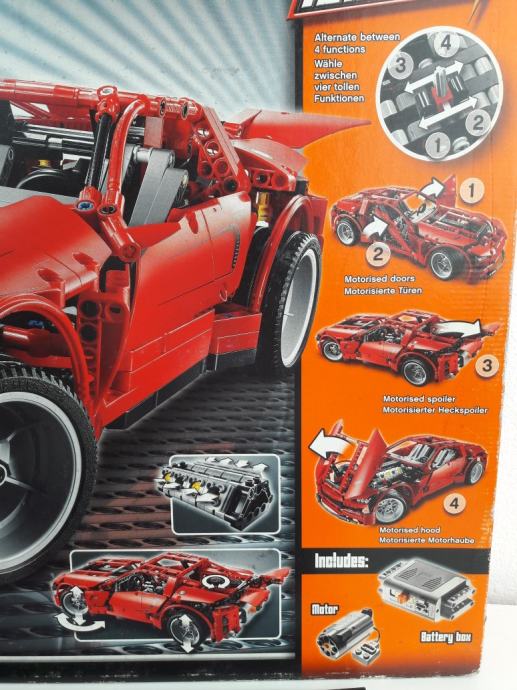 Ovaj izvrstan LEGO Technic Superautomobil sadrži motor pomoću kojeg je moguće upravljati s 4 funkcije: Otvaranje i zatvaranje stražnjeg spojlera, otvaranje i zatvaranje haube, otvaranje i zatvaranje vozačevih vrata, otvaranje i zatvaranje suvozačevih vrata. Odabir funkcije vrši se na mjenjaču u kabini auta. Pogledajte priloženi video za detaljniji prikaz navedenih funkcija. Ostale funkcije su: potpuno neovisan i funkcionalan ovjes te mogućnost upravljanja prednjim kotačima pomoću zupčanika na zadnjem dijelu auta. Tu je i vidljivi V8 motor u kojem se klipovi pomiču prilikom vožnje automobila. Dimenzije: preko 45cm dug i 20cm širok. Može se pretvoriti u crveni Hot rod s preklopnim krovom (prikazan na slikama sa stražnje strane kutije). Broj dijelova koje sadrži: 1281.