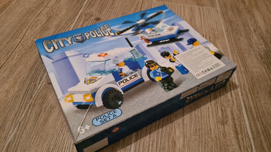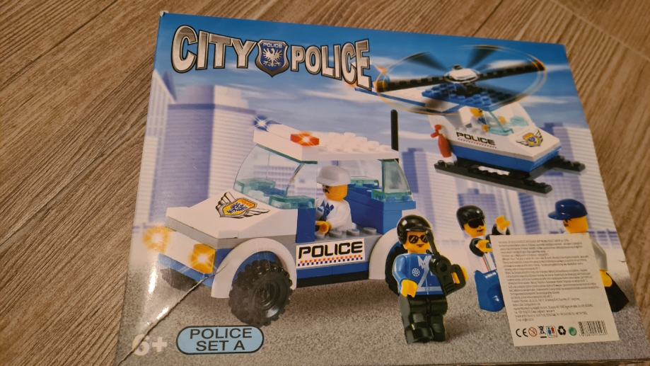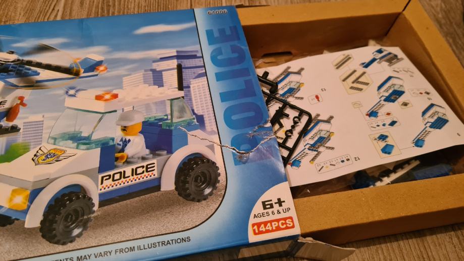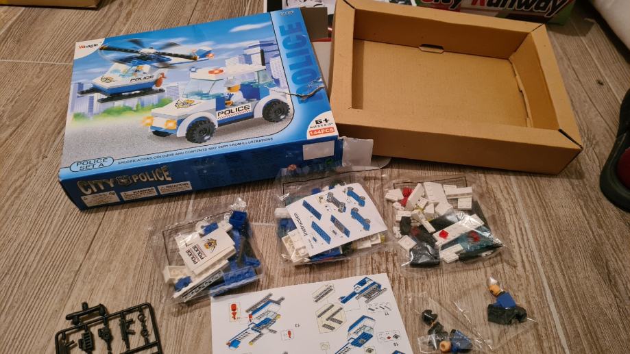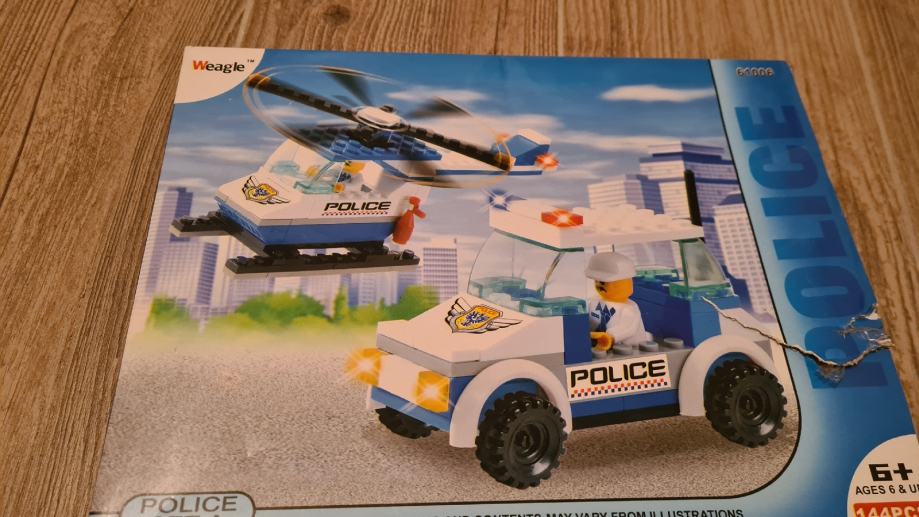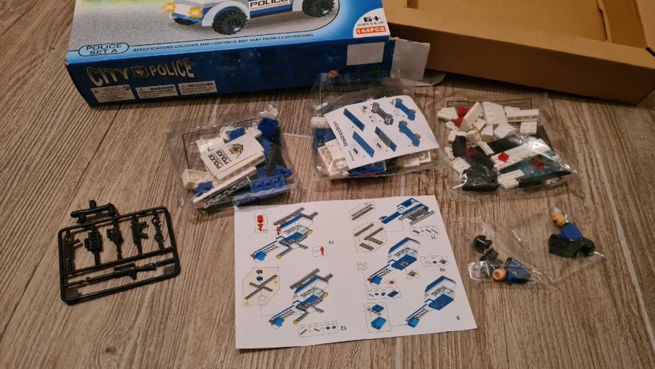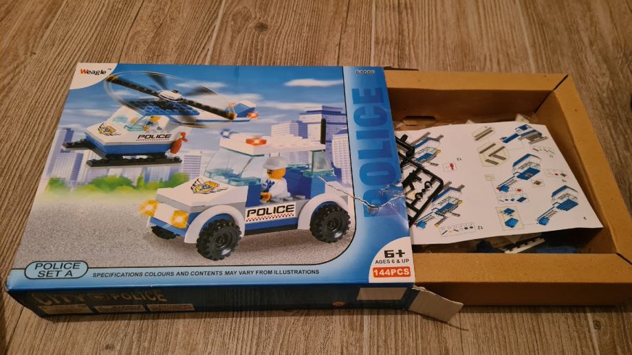 Neotvoren set kockica za slaganje policijskog auta i helikoptera od 144 djela. Oštećena kutija kako se vidi na slikama. Paketići su neotvoreni.