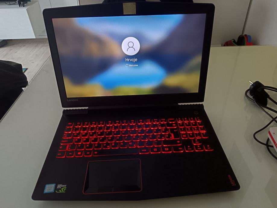 Prodajem Lenovo Legion laptop s procesorom Intel Core i5-7300HQ (7. generacija) koji radi na 2,50 GHz. Laptop ima 8 GB RAM-a i pokreće Windows 10 Home. Tipkovnica ima crveno pozadinsko osvjetljenje, a kućište je crne boje.