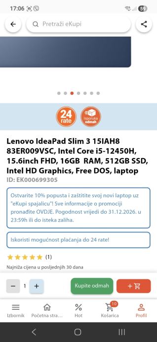 Prodajem Laptop Lenovo IdeaPad Slim 3 15IAH8 83ER009VSC, Intel Core i5-12450H, 15.6inch FHD, 16GB RAM, 512GB SSD, Intel HD Graphics