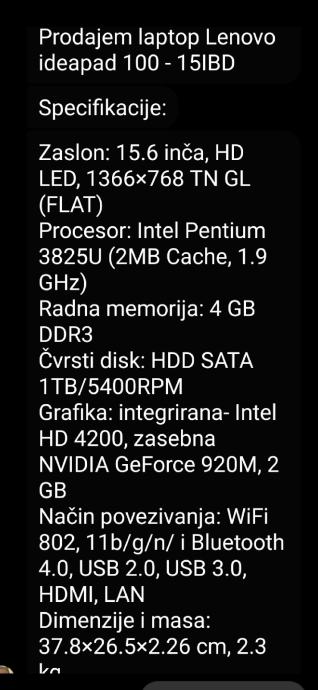 Prodajem laptop Lenovo ideapad 100-15 ibd
