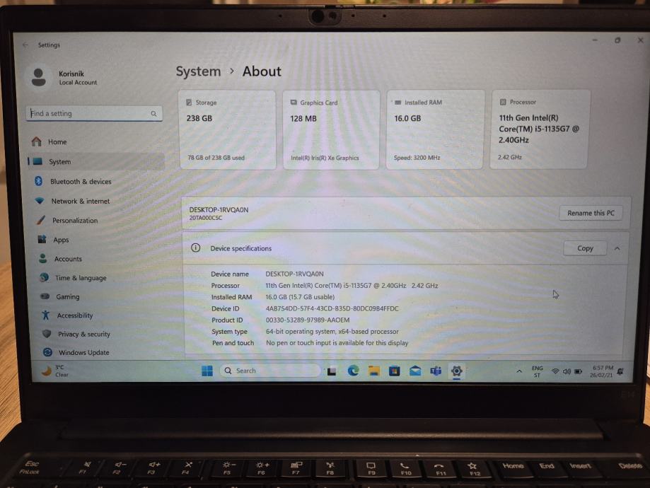 Prodajem odličan 14" laptop sa i5 procesorom 11.generacije, 240 GB SSD diskom i 16 GB RAM memorije.