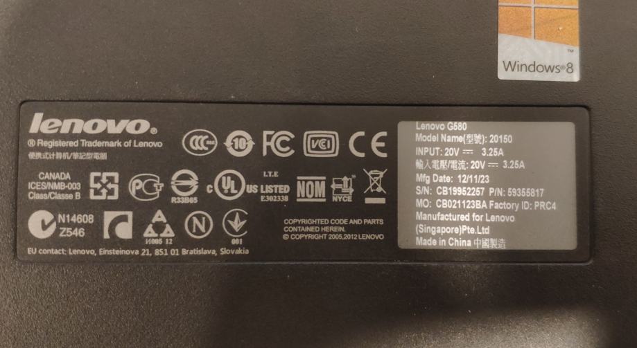LENOVO G580, INTEL PENTIUM B960, 240 SSD, 8GB RAM, W10, 1-2 h baterija