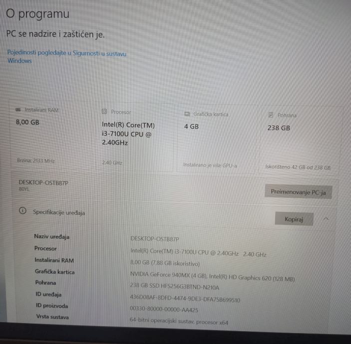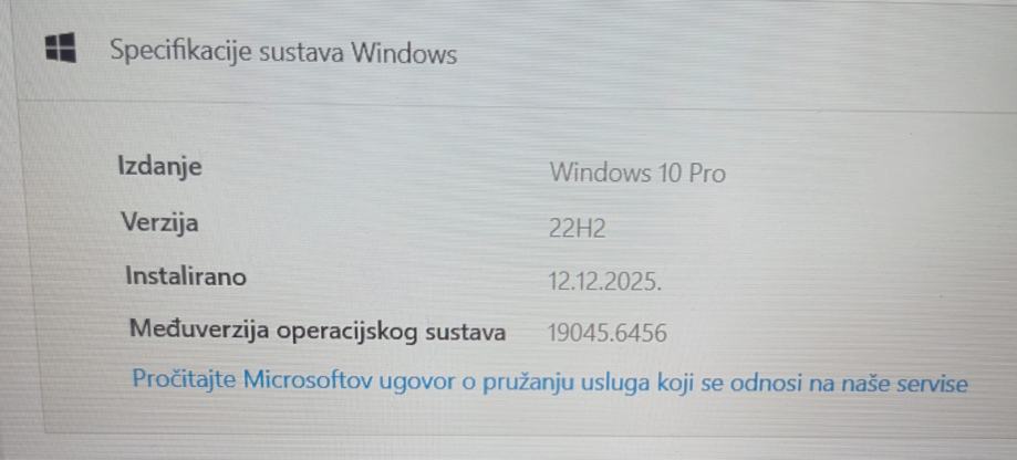 Sustav: instaliran Windows 10 Pro sa hrvatskim jezikom