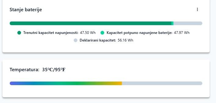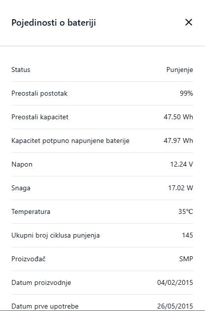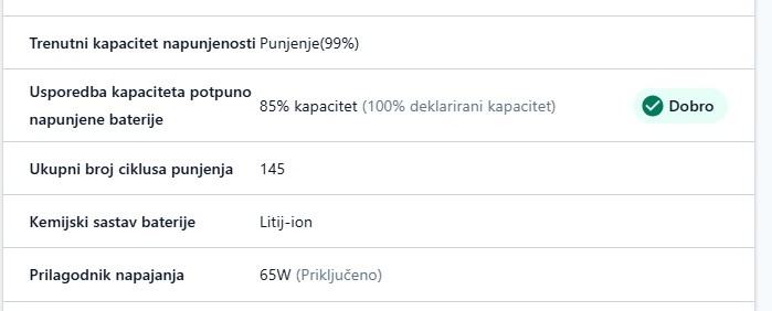 Laptop je uščuvan, ne gasi se u radu, ocjena 8/10 samo zbog tragova korištenja tipkovnice i . Baterija vrlo dobra 85% tvorničkog kapaciteta (mirovanje 4h, surfanje 3h, gledanje dvd-a 2h) - vidi slike testova baterije
